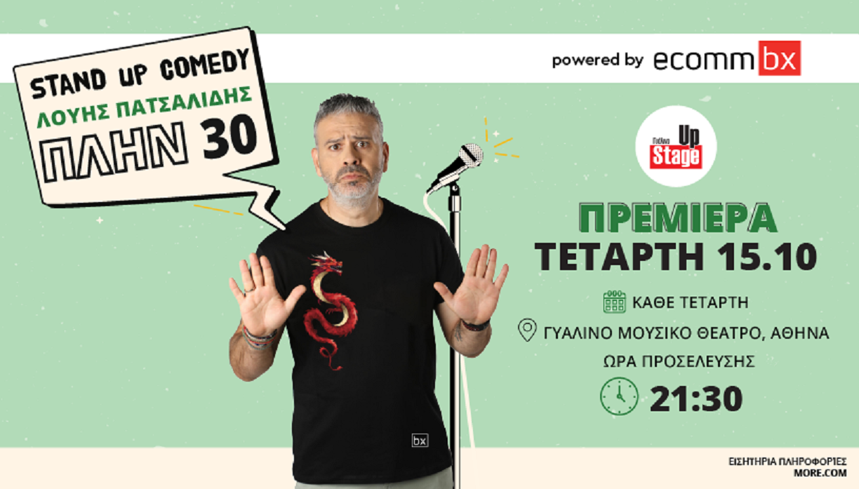 Ο Λούης Πατσαλίδης, ο πιο αγαπημένος κωμικός της Κύπρου και παρουσιαστής του δημοφιλέστερου σατιρικού show στην κυπριακή τηλεόραση («Λούης Night Show» στον Alpha Κύπρου), φέρνει το εκρηκτικό του χιούμορ στην Αθήνα, στο «Γυάλινο Μουσικό Θέατρο», με την καινούργια του παράσταση «Πλήν 30» μετατρέποντας τις Τετάρτες μας σε βραδιές γέλιου, αρχής γενομένης από την Τετάρτη 15 Οκτωβρίου.