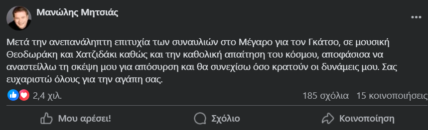 «Μετά την ανεπανάληπτη επιτυχία των συναυλιών στο Μέγαρο για τον Γκάτσο, σε μουσική Θεοδωράκη και Χατζιδάκι καθώς και την καθολική απαίτηση του κόσμου, αποφάσισα να αναστείλλω τη σκέψη μου για απόσυρση και θα συνεχίσω όσο κρατούν οι δυνάμεις μου. Σας ευχαριστώ όλους για την αγάπη σας», αναφέρει ο Μανώλης Μητσιάς.