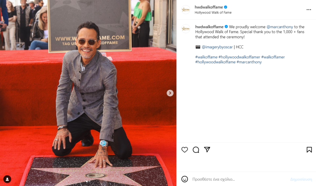 Όπως έγινε γνωστό, το δικό του αστέρι στην παγκόσμιας φήμης Λεωφόρος της Δόξας του Hollywood, απέκτησε o Marc Anthony.