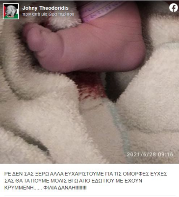 Μάλιστα, ο Τζώνυ Θεοδωρίδης έκανε γνωστό το χαρμόσυνο γεγονός, μέσα από ανάρτησή του στον προσωπικό του λογαριασμό στο Facebook, αποκαλύπτοντας παράλληλα πως η μικρή θα πάρει το όνομα Δανάη.
