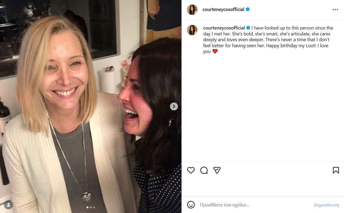 Με αφορμή τα 52α γενέθλια της Lisa Kudrow, η Courteney Cox που δεν έχουν σταματήσει να κάνουν παρέα από τότε που γνωρίστηκαν στα γυρίσματα της σειράς, θέλησε να της ευχηθεί και δημόσια.