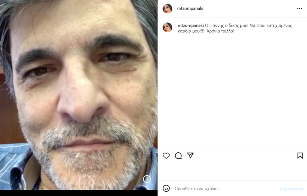 «Ο Γιάννης ο δικός μου! Να είσαι ευτυχισμένος καρδιά μου!!!!! Χρόνια πολλά!» έγραψε η Μαρία Τζομπανάκη στην ανάρτηση της, ανεβάζοντας παράλληλα μια φωτογραφία του συζύγου της.
