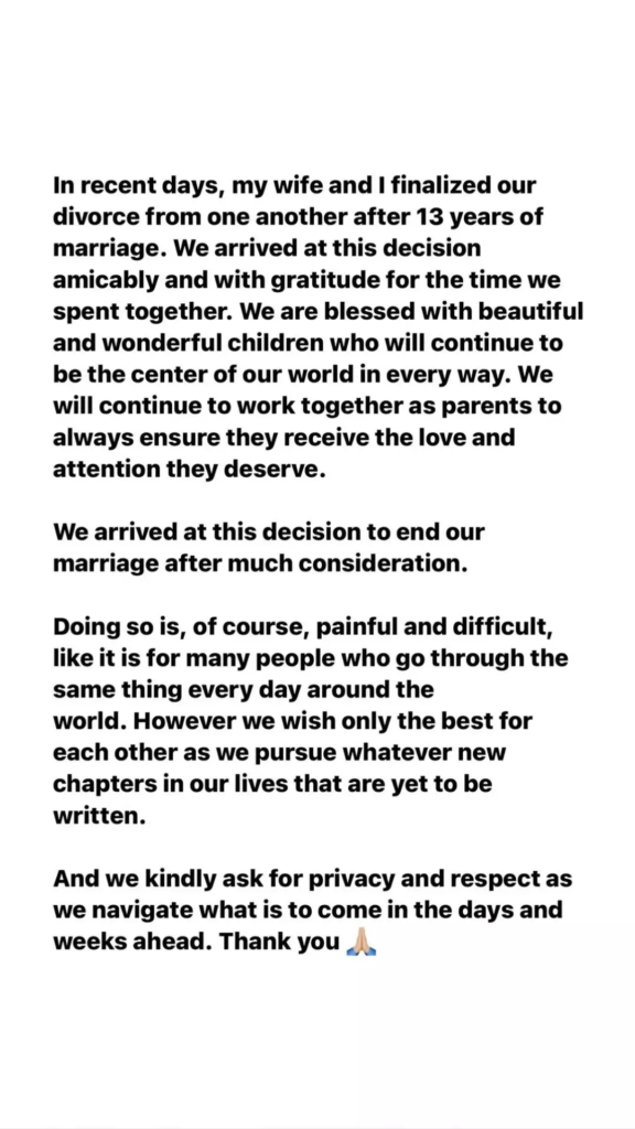 «Τις προηγούμενες μέρες, η σύζυγός μου και εγώ οριστικοποιήσαμε το διαζύγιό μας, μετά από 13 χρόνια γάμου. Φτάσαμε σε αυτήν την απόφαση φιλικά και με ευγνωμοσύνη για τα χρόνια που περάσαμε μαζί. Είμαστε ευλογημένοι με αυτά τα όμορφα και υπέροχα παιδιά, τα οποία θα συνεχίσουν να είναι το κέντρο του κόσμου μας με κάθε τρόπο. Θα συνεχίσουμε να δουλεύουμε μαζί σαν γονείς, ώστε να είμαστε βέβαιοι ότι πάντα λαμβάνουν την αγάπη και την προσοχή που τους αξίζει».