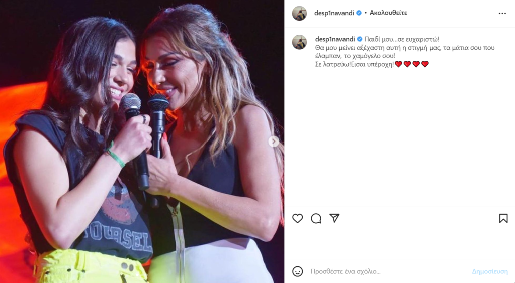 Ενώ λίγες ώρες μετά το πρώτο ντουέτο επί σκηνής με την κόρη της, η Δέσποινα Βανδή έκανε μια συγκινητική ανάρτηση στον προσωπικό της λογαριασμό στο Instagram.