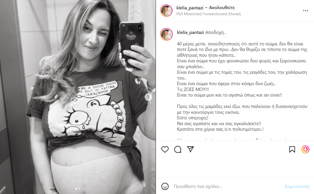 Προς όλες τις μαμάδες εκεί έξω, που παλεύουν ή δυσανασχετούν με την καινούργια τους εικόνα.. Είστε υπέροχες! Να σας αγαπάτε και να σας αγκαλιάσετε!! Κρατάτε στα χέρια σας ό,τι πολυτιμότερο..! (Η φωτογραφία είναι την επόμενη ακριβώς ημέρα από τον τοκετό)», έγραψε η Κλέλια Πανταζή στην λεζάντα του post της