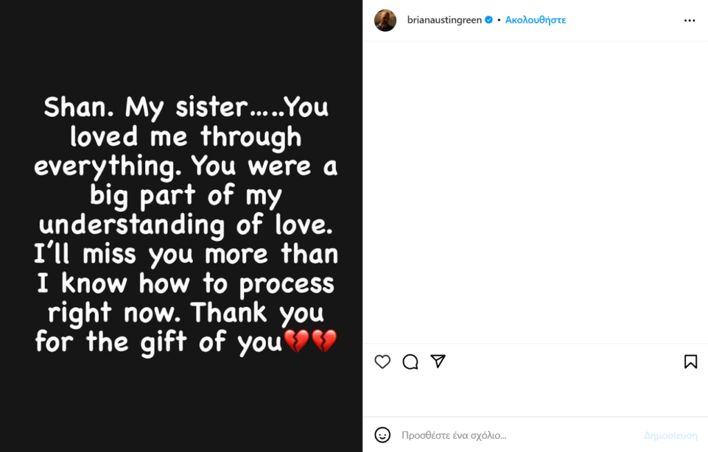 Επίσης και ο Brian Austin Green έγραψε: «Σαν. Η αδερφή μου….. Με αγάπησες σε όλα. Ήσουν ένα μεγάλο μέρος της κατανόησής μου για την αγάπη. Θα μου λείψεις περισσότερο από όσο φαντάζομαι αυτή τη στιγμή. Σε ευχαριστώ που μπήκες στη ζωή μου».