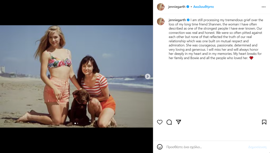 Ήταν θαρραλέα, παθιασμένη, αποφασιστική και πολύ στοργική και γενναιόδωρη. Θα μου λείπει και θα την τιμώ πάντα βαθιά στην καρδιά μου και στις αναμνήσεις μου. Η καρδιά μου ραγίζει για την οικογένειά της και τον Μπόουι και όλους τους ανθρώπους που την αγάπησαν», έγραψε η Jennie Garth και δημοσίευσε φωτογραφίες μαζί της.