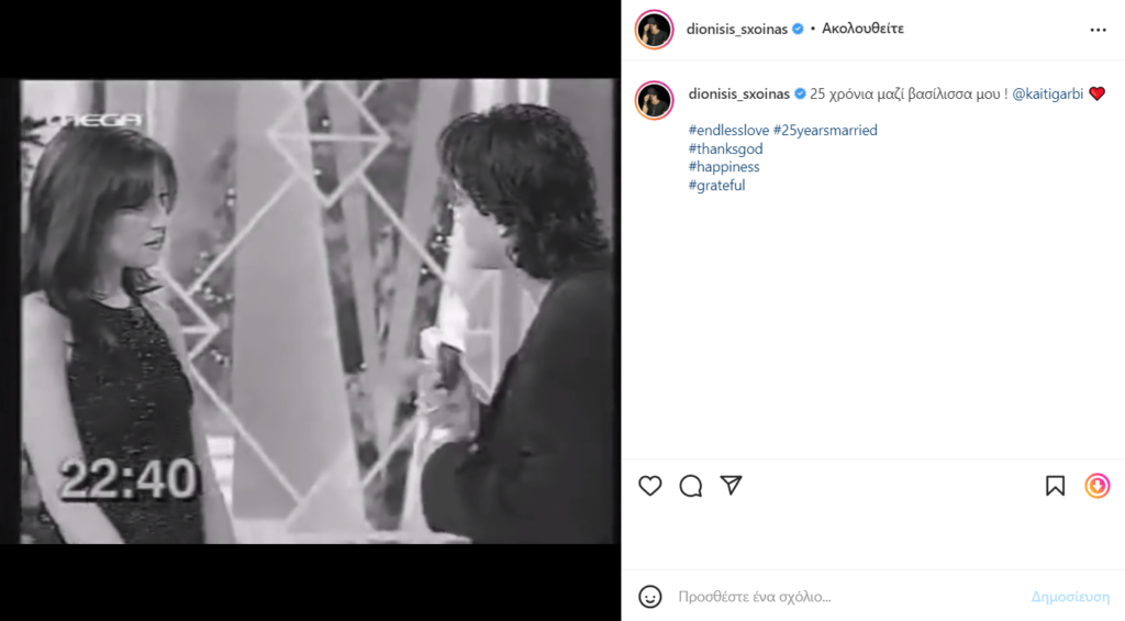 Συγκεκριμένα, ο Διονύσης Σχοινάς δημοσίευσε ένα βίντεο από την ημέρα που έκανε πρόταση γάμου στην αγαπημένη του στον αέρα της εκπομπής της Ρούλας Κορομηλά και το συνόδευσε γράφοντας: «25 χρόνια μαζί βασίλισσα μου».