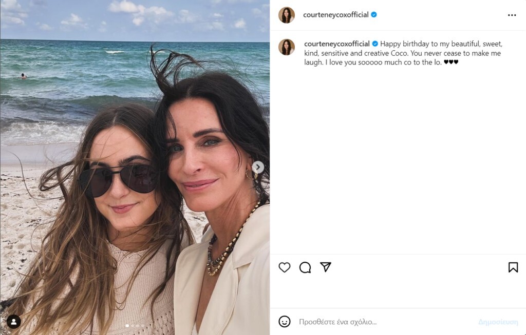 «Χρόνια πολλά στην όμορφη, γλυκιά, ευγενική, ευαίσθητη και δημιουργική Coco μου. Δεν παύεις ποτέ να με κάνεις να γελάω. Σ’ αγαπώ τόσο πολύ», έγραψε η Courteney Cox στην λεζάντα του post της.