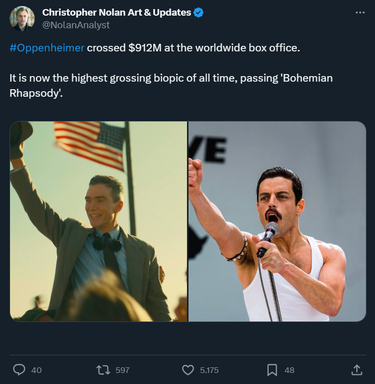 «Η ταινία #Oppenheimer ξεπέρασε τα 912 εκατ. δολάρια στο παγκόσμιο box office. Είναι πλέον η βιογραφική ταινία με τα υψηλότερα έσοδα όλων των εποχών, ξεπερνώντας το “Bohemian Rhapsody”» γράφει ο Nolan στο Twitter.