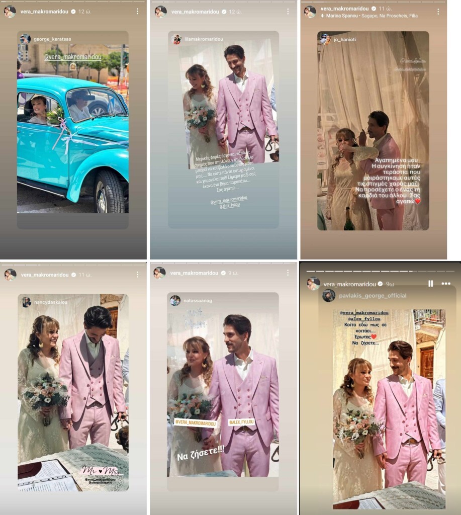 Ωστόσο λίγες ώρες μετά το τέλος του πολιτικού τους γάμου, η Βέρα Μακρομαρίδου που έγινε γνωστή στο ευρύ κοινό μέσα από τον ρόλο της Άσπας στον “Σασμό”, ανέβασε στα instastories και τις πρώτες φωτογραφίες του γάμου τους.