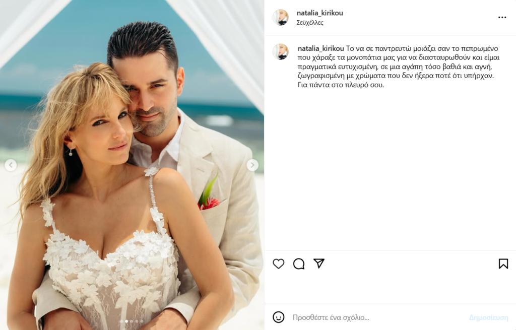 Μάλιστα, η Ναταλία ανέβασε στο προφίλ της φωτογραφίες από τον γάμο της και έγραψε στη λεζάντα: «Το να σε παντρευτώ μοιάζει σαν το πεπρωμένο που χάραξε τα μονοπάτια μας για να διασταυρωθούν και είμαι πραγματικά ευτυχισμένη, σε μια αγάπη τόσο βαθιά και αγνή, ζωγραφισμένη με χρώματα που δεν ήξερα ποτέ ότι υπήρχαν. Για πάντα στο πλευρό σου».