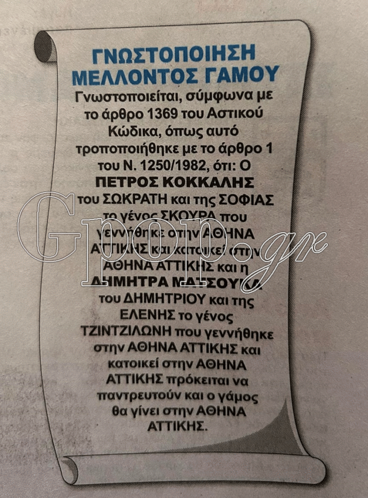 «Γνωστοποιείται σύμφωνα με το άρθρο 1369 του Αστικού Κώδικα, όπως αυτό τροποποιήθηκε με το άρθρο 1 του Ν. 1250/1982 ότι: Ο Πέτρος Κόκκαλης του Σωκράτη και της Σοφίας, το γένος Σκούρα που γεννήθηκε στην Αθήνα Αττικής και κατοικεί στην Αθήνα Αττικής και η Δήμητρα Ματσούκα του Δημητρίου και της Ελένης, το γένος Τζιντζιλώνη που γεννήθηκε στην Αθήνα Αττικής και κατοικεί στην Αθήνα Αττικής, πρόκειται να παντρευτούν και ο γάμος θα γίνει στην Αθήνα Αττικής».