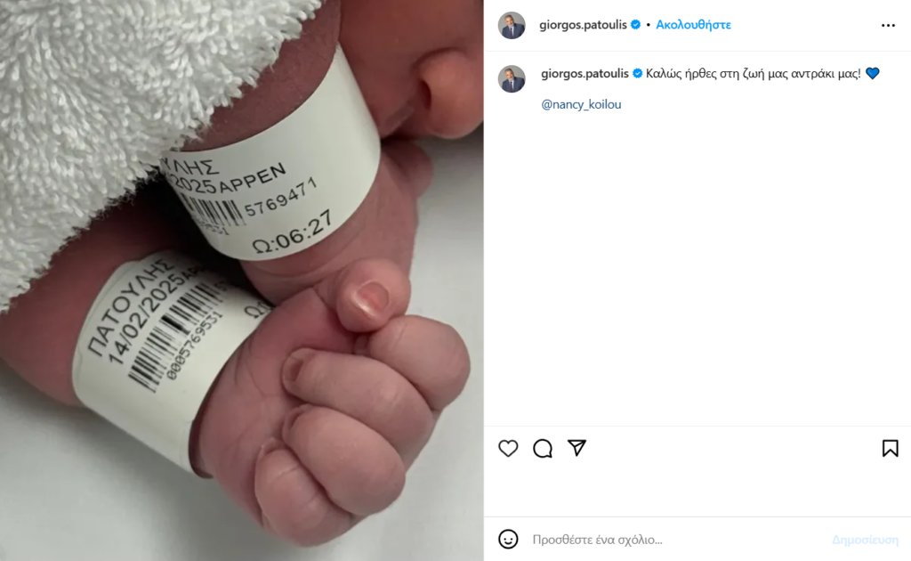 Μάλιστα, το ευχάριστο γεγονός έκανε γνωστό ο Γιώργος Πατούλης με μια ανάρτηση στον προσωπικό του λογαριασμό στο instagram, καθώς κοινοποίησε μια φωτογραφία του νεογέννητου γιου του και έγραψε στη λεζάντα της ανάρτησής του: «Καλώς ήρθες στη ζωή μας αντράκι μας!».