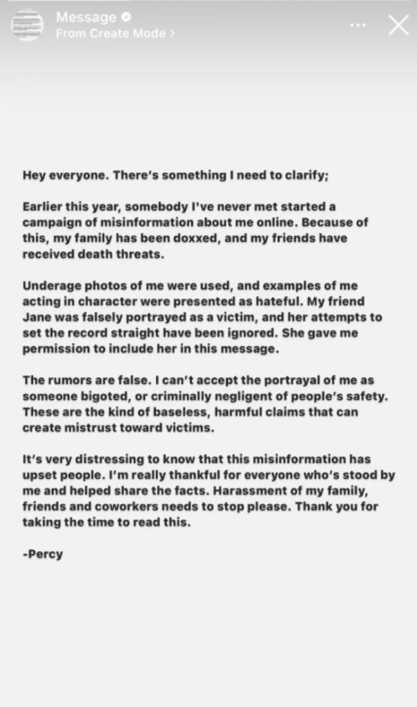 «Οι φήμες είναι ψευδείς και δεν πρόκειται να δεχτώ τους χαρακτηρισμούς που με θέλουν να είμαι ρατσιστής ή να απειλώ την ασφάλεια άλλων ανθρώπων. Αυτού του είδους οι αβάσιμοι, επιβλαβείς ισχυρισμοί μπορούν να δημιουργήσουν δυσπιστία απέναντι στα θύματα. Είναι πολύ οδυνηρό να γνωρίζω ότι αυτή η παραπληροφόρηση έχει αναστατώσει τους ανθρώπους. Είμαι πραγματικά ευγνώμων για όλους όσοι μου συμπαραστάθηκαν και βοήθησαν να αποδοθεί η αλήθεια», εξηγεί η Percy.