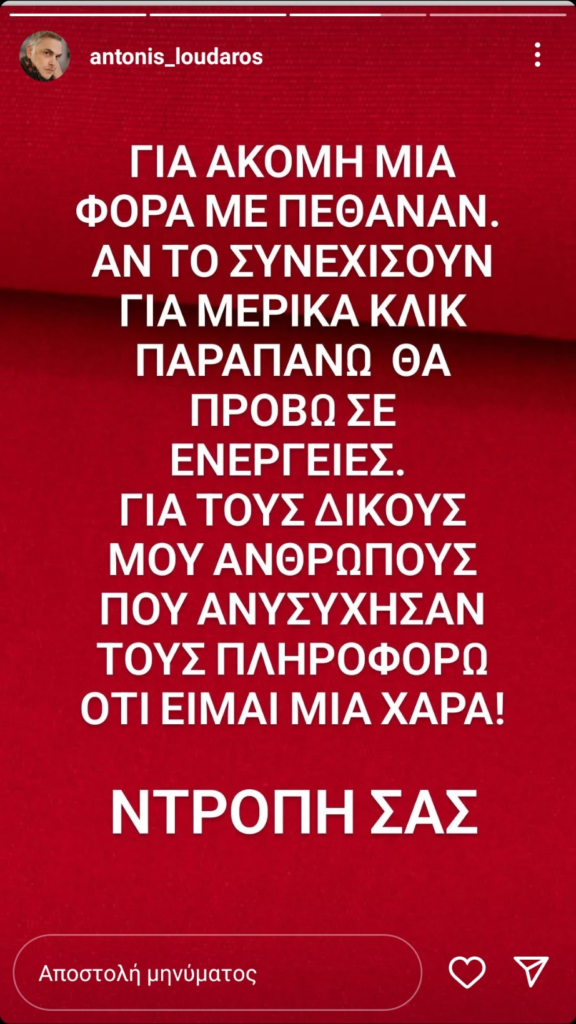 «Για ακόμα μία φορά με πέθαναν. Αν το συνεχίσουν για μερικά κλικ παραπάνω θα προβώ σε ενέργειες. Για τους δικούς μου ανθρώπους που ανησύχησαν τους πληροφορώ ότι είμαι μία χαρά ντροπή σας» έγραψε ο Αντώνης Λουδάρος στην ανάρτηση του.