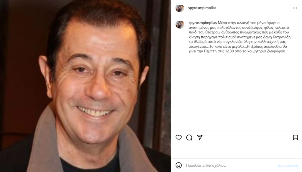 «Μέσα στην αλλαγή του μήνα έφυγε ο αγαπημένος μας πολυτάλαντος συνάδελφος, φίλος, γελαστό παιδί του θεάτρου, άνθρωπος πνευματικός που με κάθε του κίνηση παρήγαγε πολιτισμό! Αγαπημένε μας Δανή Κατρανίδη το θλιβερό αυτό νέο συγκλονίζει όλη την καλλιτεχνική μας οικογένεια….Το κενό είναι μεγάλο….» έγραψε ο Σπύρος Μπιμπίλας στην ανάρτηση του.