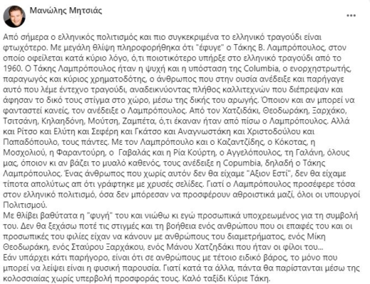 Η ανάρτηση του Μανώλη Μητσιά