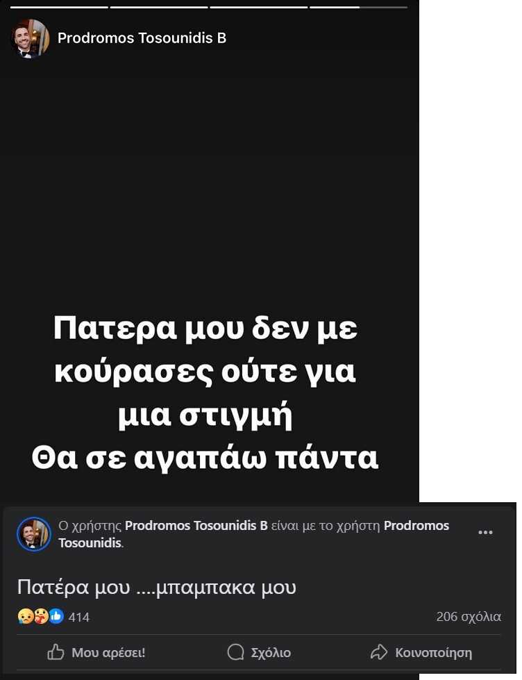 «Πατέρα μου δεν με κούρασες ούτε για μια στιγμή. Θα σε αγαπώ πάντα», έγραψε ο Πρόδρομος Τοσουνίδης σε μια φωτογραφία με μαύρο φόντο.