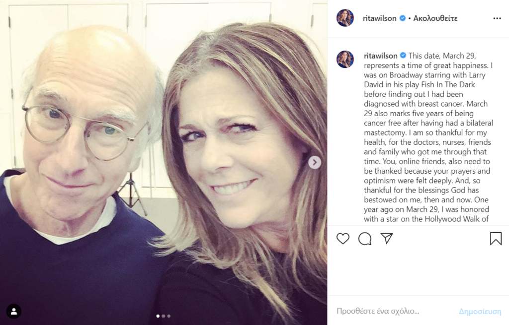 Νιώθω τόσο ευγνώμων για την υγεία μου, για τους γιατρούς, για τις νοσοκόμες, για τους φίλους και την οικογένεια μου που μου στάθηκαν στη δυσκολότερη περίοδο της ζωής μου. Σήμερα γιορτάζω την ομορφιά της ζωής, την ευλογία του Θεού και την καλή πορεία της υγείας μου, έχοντας επιζήσει και από τον Covid- 19. Γι΄αυτό σας παρακαλώ, αφιερώστε λίγα λεπτά σήμερα στο σώμα σας και νιώστε ευγνωμοσύνη για αυτά που έχετε», έγραψε η Rita Wilson.