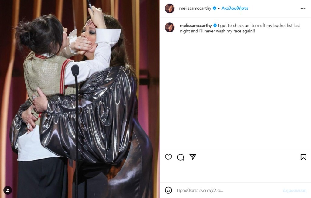 «Έπρεπε να μαρκάρω ένα πράγμα από τη λίστα επιθυμιών μου χθες το βράδυ και δεν πρόκειται να πλύνω ποτέ ξανά το πρόσωπό μου!», έγραψε η McCarthy στη φωτογραφία που μοιράστηκε με τους followers της.