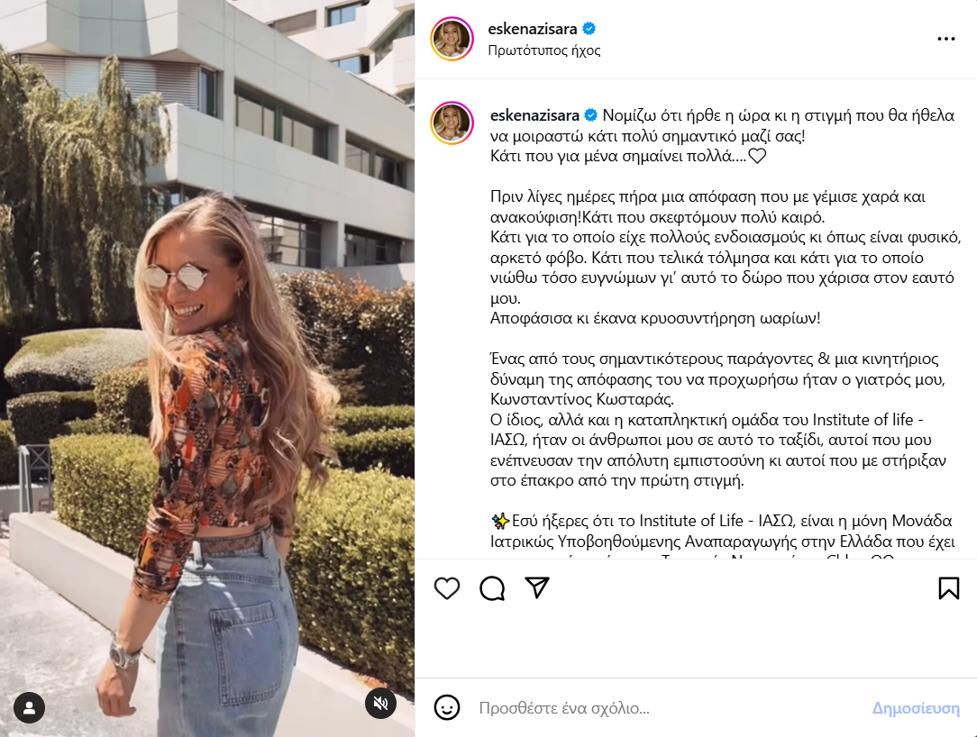 «Νομίζω ότι ήρθε η ώρα κι η στιγμή που θα ήθελα να μοιραστώ κάτι πολύ σημαντικό μαζί σας! Κάτι που για μένα σημαίνει πολλά….Πριν λίγες ημέρες πήρα μια απόφαση που με γέμισε χαρά και ανακούφιση! Κάτι που σκεφτόμουν πολύ καιρό. Κάτι για το οποίο είχα πολλούς ενδοιασμούς κι όπως είναι φυσικό, αρκετό φόβο. Κάτι που τελικά τόλμησα και κάτι για το οποίο νιώθω τόσο ευγνώμων γι’ αυτό το δώρο που χάρισα στον εαυτό μου. Αποφάσισα κι έκανα κρυοσυντήρηση ωαρίων! Ένας από τους σημαντικότερους παράγοντες & μια κινητήριος δύναμη της απόφασης του να προχωρήσω ήταν ο γιατρός μου, Κωνσταντίνος Κωσταράς.