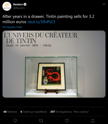Ένα σχέδιο του Τεντέν, το οποίο παρέμενε για χρόνια διπλωμένο σε ένα συρτάρι, πουλήθηκε σήμερα σε δημοπρασία στο Παρίσι, έναντι του ποσού των 3,175 εκατομμυρίων ευρώ, έγινε γνωστό από τον οίκο δημοπρασιών.