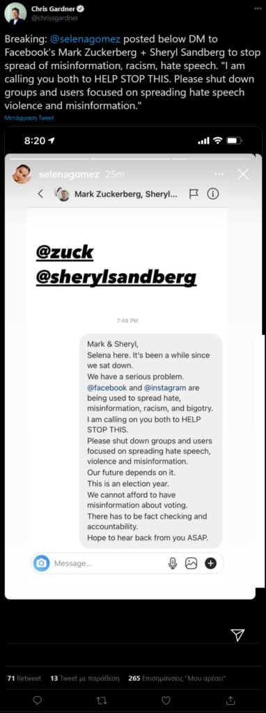 “Σας καλώ να βοηθήσετε να σταματήσουν το Facebook και το Instagram να χρησιμοποιούνται για την διάδοση μίσους, παραπληροφόρησης, ρατσισμού και μισαλλοδοξίας”, έγραφε η Selena Gomez και πρόσθεσε: “Κλείστε τις ομάδες και τους χρήστες που υποκινούν βία, μίσος και παραπληροφόρηση. Το μέλλον μας εξαρτάται από αυτό”.