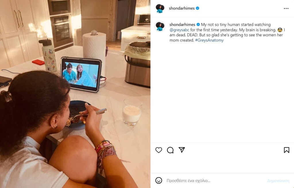 «Ο όχι και τόσο μικροσκοπικός μου άνθρωπος άρχισε να βλέπει το @greysabc για πρώτη φορά χθες. Ο εγκέφαλός μου σπάει. 🤯 Είμαι νεκρός. ΝΕΚΡΟΣ. Αλλά τόσο χαρούμενη που βλέπει τις γυναίκες που δημιούργησε η μαμά της», έγραψε η Shonda Rhimes στην ανάρτηση της.