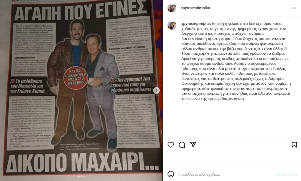 Τόση προχειρότητα… φανταστείτε πως γράφουν τα άρθρα… Αρκεί να γεμίσουμε τις σελίδες με πικάντικα κι ας παίζουμε με το ψυχικό κόσμο ανθρώπων. Λοιπόν ο συγκεκριμένος ηθοποιός που είναι πλάι μου από την πρεμιέρα του Παλλάς είναι νεότερος και πολύ καλός ηθοποιός με ιδιαίτερες δεξιότητες για το θέατρο στις πολεμικές τέχνες ο Λάμπρος Οικονομίδης και καμία σχέση δεν έχει με αυτόν που νομίζει η εφημερίδα, ούτε φυσικά με την φαντασία του υπογράφοντα», έγραψε ο Σπύρος Μπιμπίλας στην ανάρτηση του ανέβασε σχετικές φωτογραφίες.