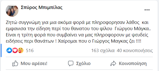 «Ζητώ συγγνώμη για μια ακόμα φορά με πληροφορήσαν λάθος και εμφάνισα την είδηση περί του θανάτου του φίλου Γιώργου Μάγκα.. Είναι η τρίτη φορά που συμβαίνει να μας πληροφορούν με ψευδείς ειδήσεις περί θανάτων ! Χαίρομαι που ο Γιώργος Μάγκας ζει !!!!» έγραψε χαρακτηριστικά στην νέα του ανάρτηση ο Σπύρος Μπιμπίλας.