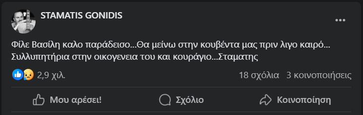 «Φίλε Βασίλη καλο παράδεισο…Θα μείνω στην κουβέντα μας πριν λίγο καιρό… Συλλυπητήρια στην οικογένεια του και κουράγιο… Σταμάτης» έγραψε ο Σταμάτης Γονίδης, αποκαλύπτοντας πως οι δυο τους μίλησαν πρόσφατα.