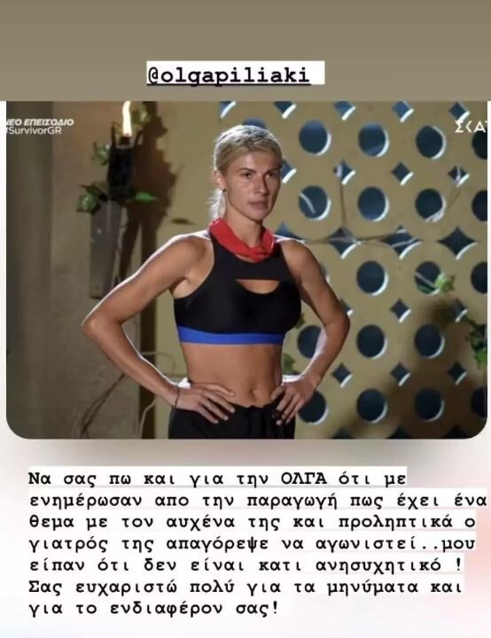 «Να σας πω και για τη Όλγα ότι με ενημέρωσαν από την παραγωγή πως έχει ένα θέμα με τον αυχένα της και προληπτικά ο γιατρός της απαγόρεψε να αγωνιστεί. Μου είπαν ότι δεν είναι κάτι ανησυχητικό. Σας ευχαριστώ πολύ για τα μηνύματα και για το ενδιαφέρον σας», έγραψε ο Στέλιος Χανταμπάκης στην ανάρτησή του.