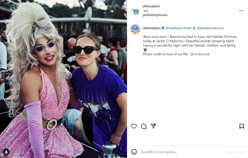 Ενώ η Portman που απόλαυσε το νησί των ανέμων και διασκέδασε ξέφρενα μέχρι πρωίας, χόρεψε με μία drag queen, σε γνωστό μαγαζί του νησιού και το βίντεο έκανε τον γύρο του διαδικτύου. Σε κάποιες άλλες εικόνες, φαίνεται να βρίσκεται σε κάποια παραλία.