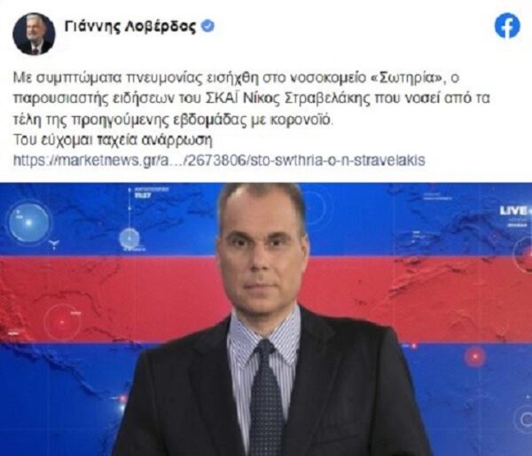 «Με συμπτώματα πνευμονίας εισήχθη στο νοσοκομείο «Σωτηρία», ο παρουσιαστής ειδήσεων του ΣΚΑΪ Νίκος Στραβελάκης που νοσεί από τα τέλη της προηγούμενης εβδομάδας με κορονοϊό. Του εύχομαι ταχεία ανάρρωση», έγραψε χωρίς να αναφέρεται στην κατάσταση υγείας του Νίκου Στραβελάκη.