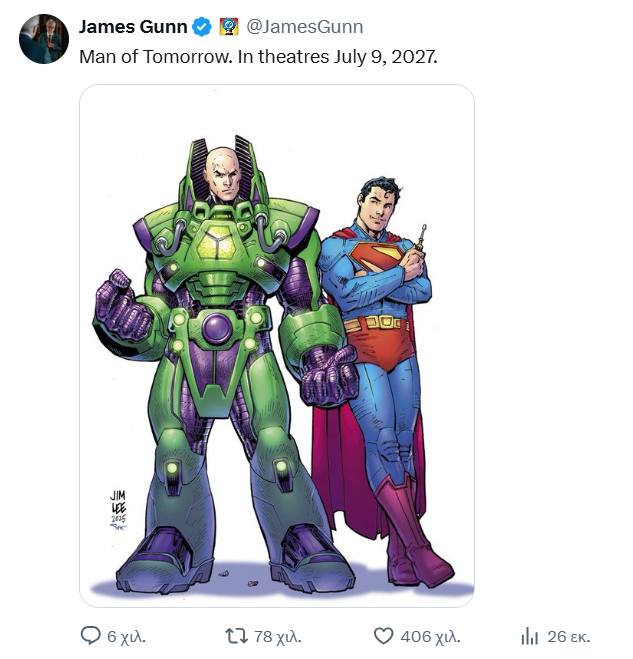 Μάλιστα, ο σκηνοθέτης της DC Films μέσα από τα social media, ανακοίνωσε ότι η νέα ταινία θα έχει τον τίτλο «Superman: Man of Tomorrow» και θα κάνει το ντεμπούτο της στις αίθουσες στις 9 Ιουλίου 2027.