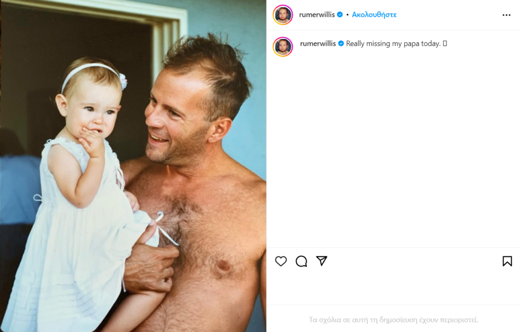 «Πραγματικά μου λείπει ο μπαμπάς μου σήμερα», έγραψε η Rumer Willis στη λεζάντα της throwback φωτογραφίας.