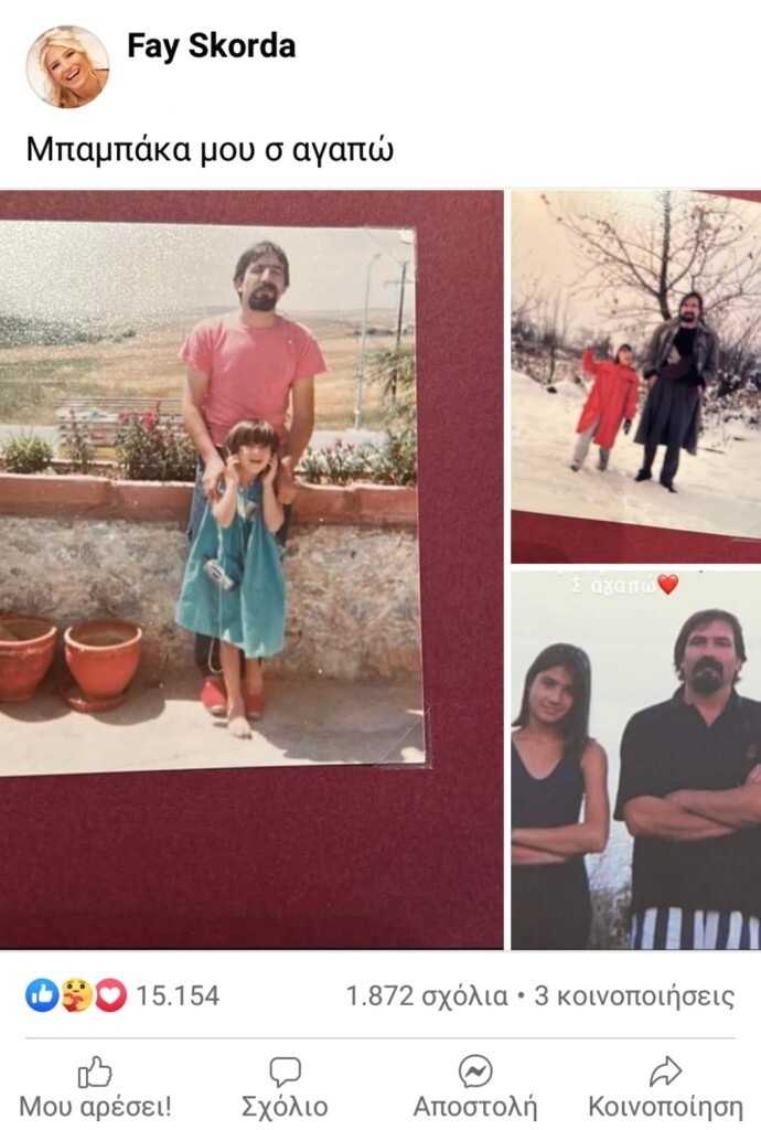 «Μπαμπάκα μου σ’ αγαπω» έγραψε η Φαίη Σκορδά στην ανάρτηση της, ανεβάζοντας μια σειρά με παλιότερες κοινές της φωτογραφίες με τον πατέρα της, Δημήτρη.