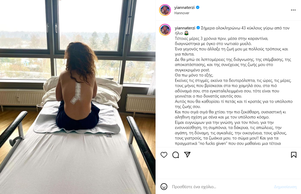 «Σήμερα ολοκληρώνω 43 κύκλους γύρω από τον ήλιο. Τέτοιες μέρες 3 χρόνια πριν, μέσα στην καραντίνα, διαγνώστηκα με όγκο στο νωτιαίο μυελό.