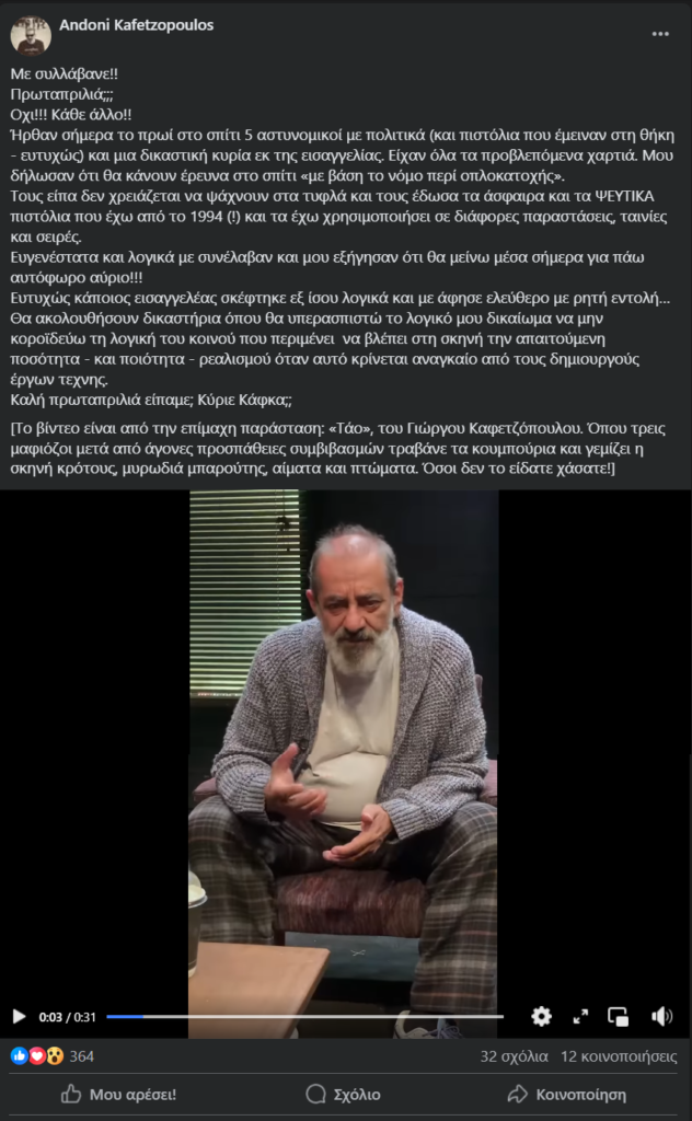Τους είπα δεν χρειάζεται να ψάχνουν στα τυφλά και τους έδωσα τα άσφαιρα και τα ΨΕΥΤΙΚΑ πιστόλια που έχω από το 1994 (!) και τα έχω χρησιμοποιήσει σε διάφορες παραστάσεις, ταινίες και σειρές.