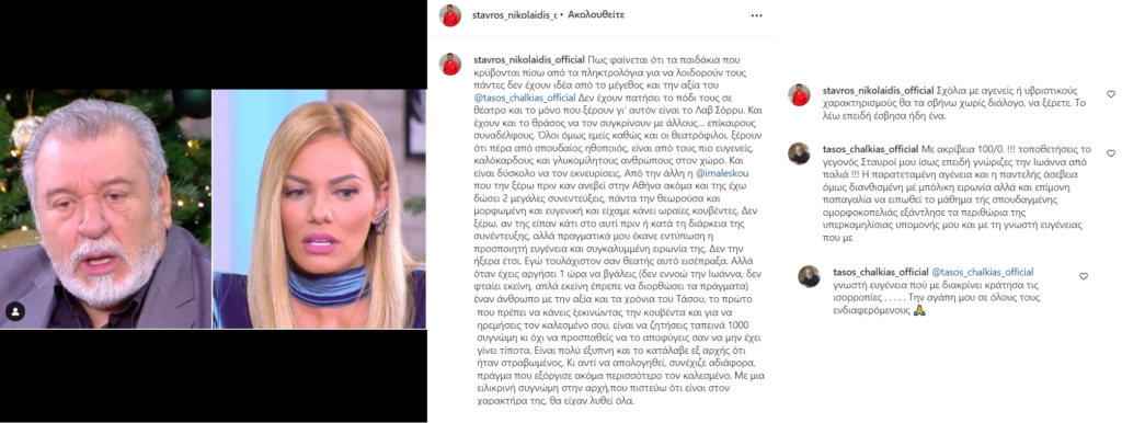 «Πως φαίνεται ότι τα παιδάκια που κρύβονται πίσω από τα πληκτρολόγια για να λοιδορούν τους πάντες δεν έχουν ιδέα από το μέγεθος και την αξία του @tasos_chalkias_official Δεν έχουν πατήσει το πόδι τους σε θέατρο και το μόνο που ξέρουν γι’ αυτόν είναι το Λαβ Σόρρυ. Και έχουν και το θράσος να τον συγκρίνουν με άλλους… επίκαιρους συναδέλφους. Όλοι όμως εμείς καθώς και οι θεατρόφιλοι, ξέρουν ότι πέρα από σπουδαίος ηθοποιός, είναι από τους πιο ευγενείς, καλόκαρδους και γλυκομίλητους ανθρώπους στον χώρο. Και είναι δύσκολο να τον εκνευρίσεις.