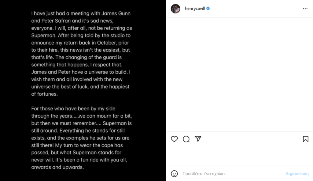 «Μόλις είχα μια συνάντηση με τον James Gunn και τον Peter Safran και τα νέα είναι δυσάρεστα. Τελικά δεν πρόκειται να επιστρέψω ως Superman. Η είδηση δεν είναι εύκολη να τη μοιραστώ, δεδομένου ότι το στούντιο τον περασμένο Οκτώβρη μού είπε να ανακοινώσω την επιστροφή μου στον ρόλο… Αλλά έτσι είναι η ζωή. Η αλλαγή σκυτάλης είναι κάτι που συμβαίνει. Το σέβομαι αυτό. Ο James και ο Peter έχουν να χτίσουν ένα σύμπαν. Εύχομαι στους δυο τους, καθώς και σε όλους όσυς θα εμπλακούν στο νέο σύμπαν, καλή τύχη.