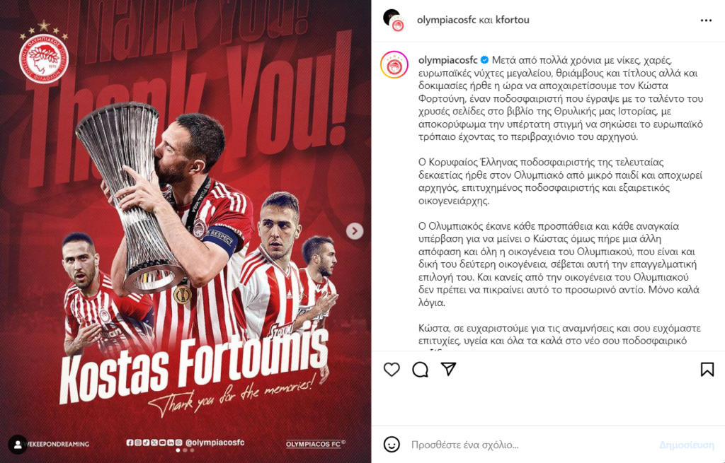 Μετά από 10 συνεχόμενα χρόνια στον Ολυμπιακό και την κατάκτηση του Conference League, αποτελεί και πλέον επίσημα παρελθόν ως αρχηγός ο Κώστας Φορτούνης από την ομάδα.