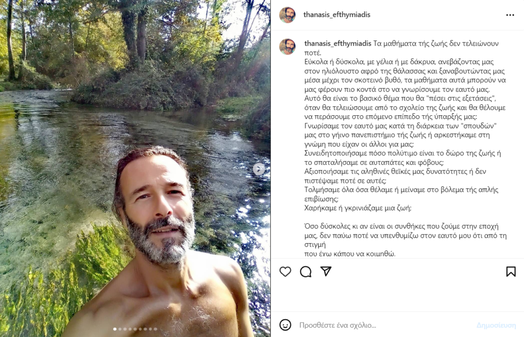 O Θανάσης Ευθυμιάδης που είναι ιδιαίτερα ενεργός στα social media, μοιράστηκε με τους followers του μια φωτογραφία από τον ποταμό Ζυγάκτη και την συνόδευσε με ένα μακροσκελές κείμενο, στο οποίο αναφέρθηκε στις διάφορες ανησυχίες του και τα πράγματα για τα οποία είναι ευγνώμων στη ζωή.