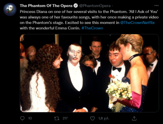 «Η πριγκίπισσα Νταϊάνα σε μια από τις αρκετές επισκέψεις της στο “Φάντασμα”. Το “All I Ask Of You” υπήρξε πάντοτε ένα από τα αγαπημένα της τραγούδια, ενώ έφτιαξε ένα ιδιωτικό βίντεο στη σκηνή του Φάντομ. Ενθουσιασμένοι να δούμε τη σκηνή αυτή στο The Crown με την υπέροχη Έμα Κόριν» έγραφε η δημοσίευση.