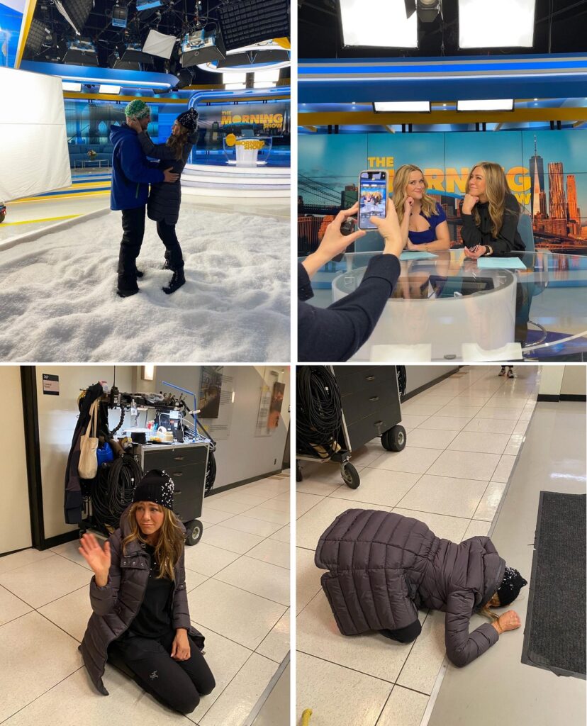 Ντυμένη με puffer jacket και σκούφο, σε ένα σκηνικό που μοιάζει καλυμμένο με χιόνι, η Jennifer Aniston αγκαλιάζει μέλη του καστ και στην τελευταία φωτογραφία της ανάρτησης, φαίνεται να προσκυνάει στο πάτωμα, ως μια υπέρτατη χειρονομία σεβασμού και ταπεινότητας.