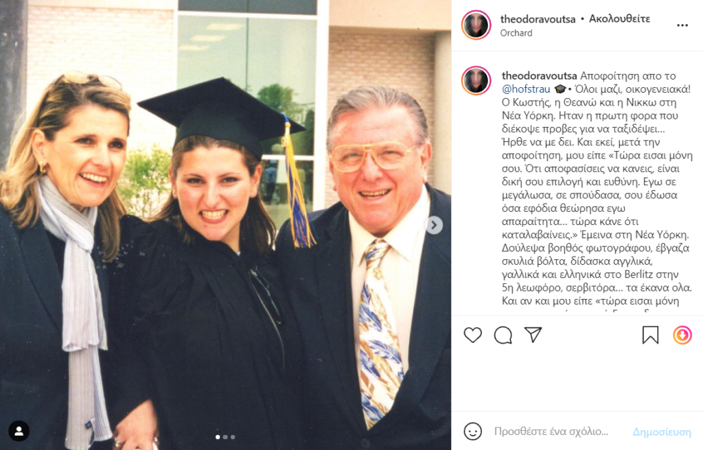 «Αποφοίτηση από το @hofstrau. Όλοι μαζί, οικογενειακά! Ο Κωστής, η Θεανώ και η Νίκκω στη Νέα Υόρκη. Ήταν η πρώτη φορά που διέκοψε πρόβες για να ταξιδέψει… Ήρθε να με δει. Και εκεί, μετά την αποφοίτηση, μου είπε «Τώρα είσαι μόνη σου. Ότι αποφασίσεις να κάνεις, είναι δική σου επιλογή και ευθύνη.