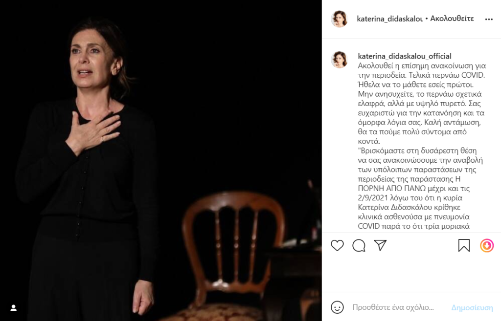 “Βρισκόμαστε στη δυσάρεστη θέση να σας ανακοινώσουμε την αναβολή των υπόλοιπων παραστάσεων της περιοδείας της παράστασης Η ΠΟΡΝΗ ΑΠΟ ΠΑΝΩ μέχρι και τις 2/9/2021 λόγω του ότι η κυρία Κατερίνα Διδασκάλου κρίθηκε κλινικά ασθενούσα με πνευμονία COVID παρά το ότι τρία μοριακά τεστ βγήκαν αρνητικά!