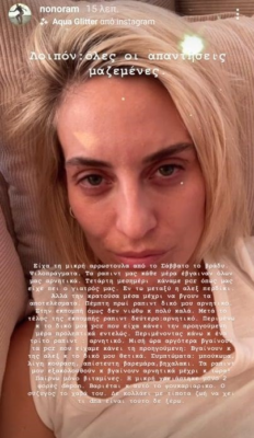 «Είχα τη μικρή αρρωστούλα από το Σάββατο το βράδυ. Ψιλοπράγματα. Τα ραπιντ μας κάθε μέρα έβγαιναν όλων μας αρνητικά. Τετάρτη μεσημέρι κάναμε pcr όπως μας είχε πει ο γιατρός μας. Εν τω μεταξύ η Άλεξ περδίκι. Αλλά την κρατούσα μέσα μέχρι να βγουν τα αποτελέσματα.