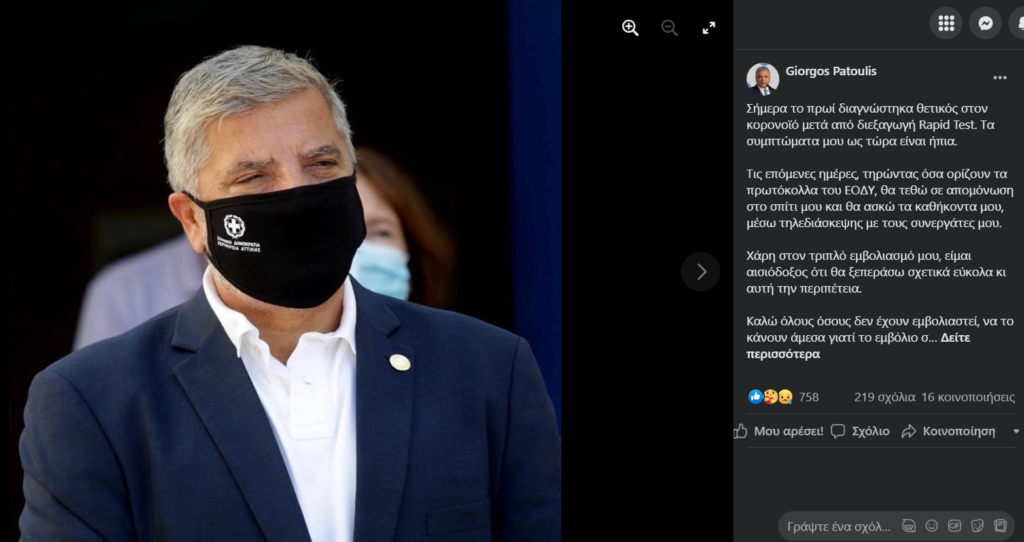 Με μια ανάρτηση του μέσα από τον προσωπικό του λογαριασμό στο Facebook ο Γιώργος Πατούλης ανακοίνωσε πως είναι θετικός στον κορονοϊό.
